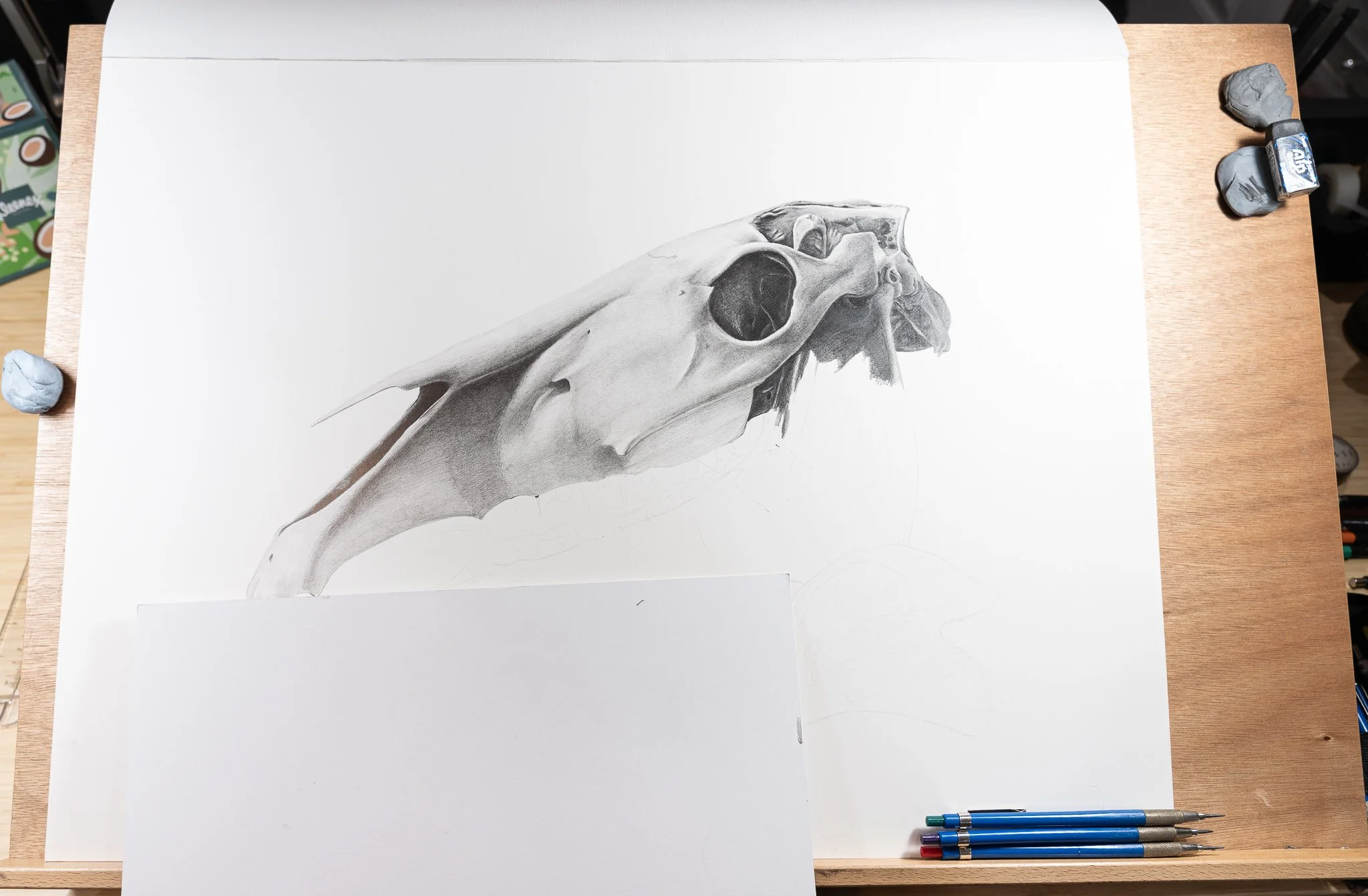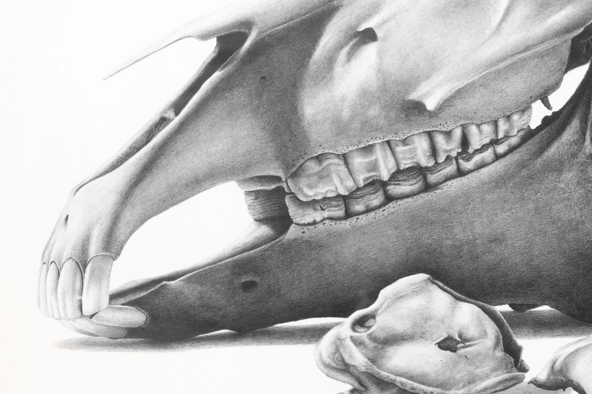 To get myself up to speed with horse skull and vertebrae anatomy, I completed this preliminary anatomical sketch of the major features to familiarize myself with both the general shape of the skull, but more specifically, the major landmarks that my reference photos might not accentuate enough in the final piece.
